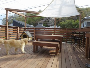 ボクの家へようこそ、ターフの日陰も快適さ。ドックラン&ペットちゃん共用LDKデッキ|東京都Y様邸